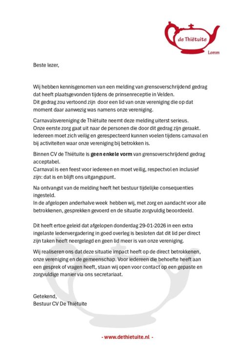 Statement CV de Thiëtuite Bericht navigatieVorigeVorig berichtBoerebroedspaar 2026 RoajeVolgendeVolgend berichtBoerebroëdspaar 2026 bekind!Gerelateerde berichtenProgramma Carnaval 2026februari 12, 2026Boerebroëdspaar 2026 bekind!februari 11, 2026Boerebroedspaar 2026 Roajejanuari 23, 2026Trio & Jeugdtrio 2026 bekend!januari 19, 2026Veurballe 2026januari 8, 2026Prins 2026 Roajedecember 23, 2025